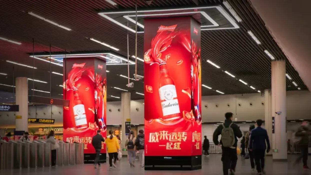 JCDecaux het ‘n soortgelyke metode gebruik toe hulle met die bierhandelsmerk Budweiser gewerk het aan ‘n projek op die Sjanghai-metrostelsel. Hier is digitale skerms om groot pilare regoor die Metro gedraai, wat die aandag van besige pendelaars getrek het wat andersins nie installasies soos tradisionele, kleiner skerms of selfs gedrukte plakkate en advertensieborde sou opgemerk het nie.