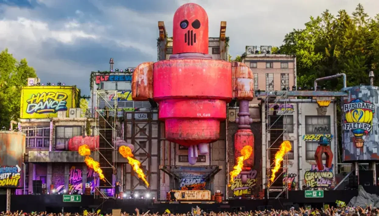 صممت شركة Revolution Event مصنع هارد دانس فاكتوري ليبدو وكأنه ورشة عمل روبوتات مهجورة كان هذا القابل للنفخ هو محور العرض. تمت طباعته على قماش بوليستر مقاوم للحريق بوزن 195 جم/م² على طابعة Durst 512R LED وقصه على قاطعة Zund D3. ثم تم خياطة المكونات معًا لتشكيل المطاطية النهائية. ويوفر هذا النهج بديلاً مستداماً للكميات الهائلة من البوليسترين التي كانت تستخدم سابقاً في المهرجانات.