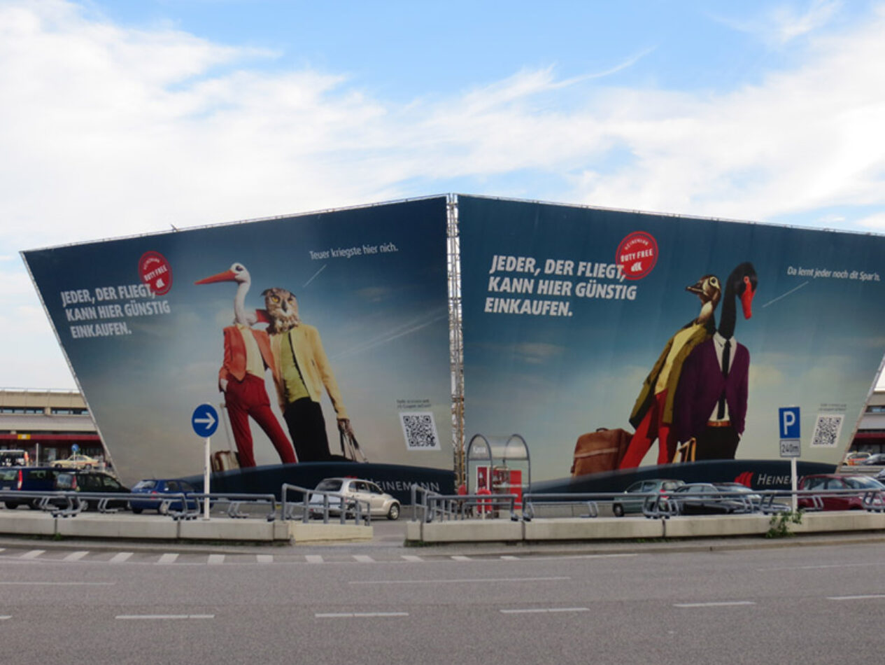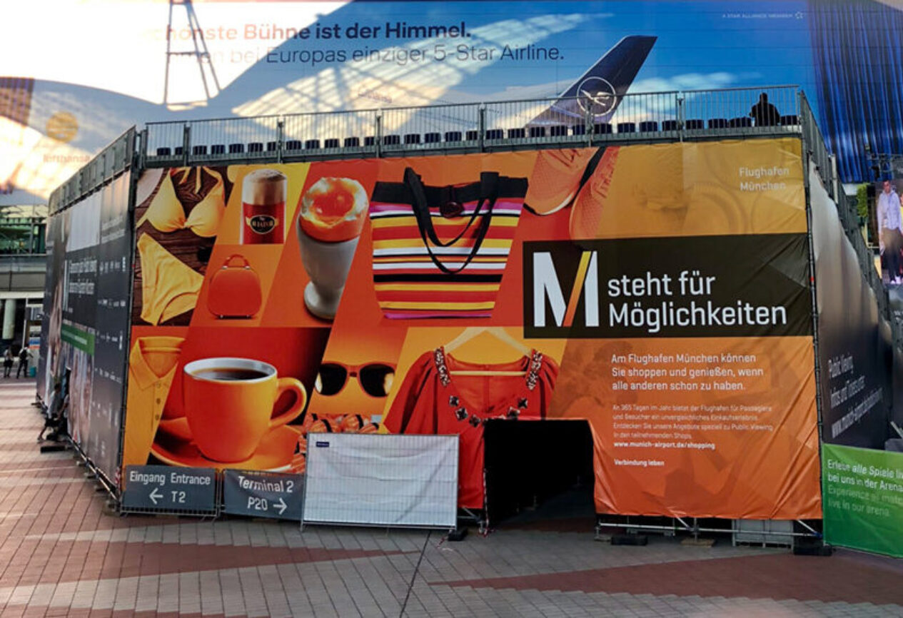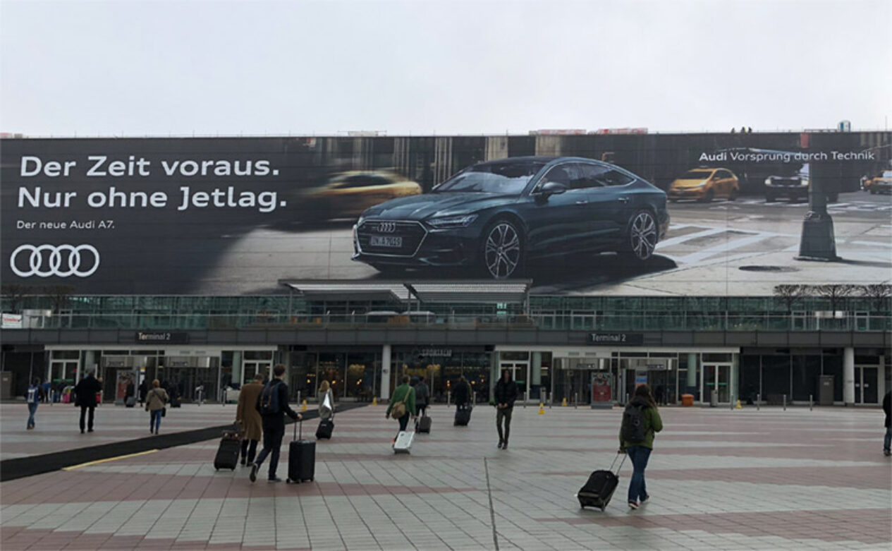 Účel: Širokoformátový billboard Audi propaguje jejich nejnovější sportovní vůz u hlavního vchodu do Terminálu 2 mnichovského letiště.