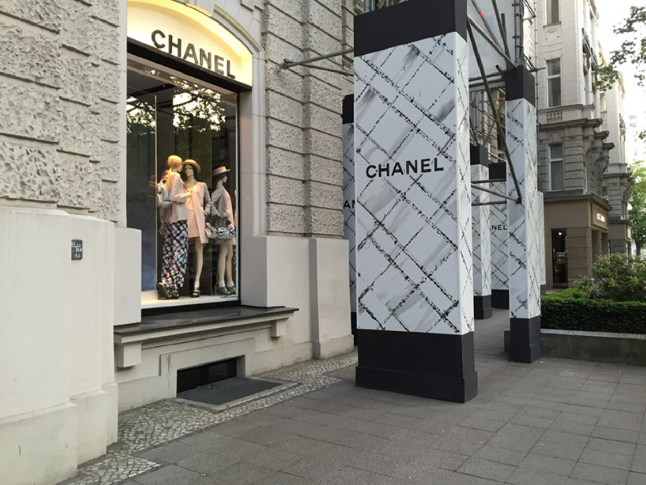 Účel: Když se v roce 2016 přestavovala slavná berlínská prodejna Chanel na Kurfürstendamm, byla před prodejnou postavena dvojice digitálně potištěných sloupů, které měly kompenzovat probíhající stavební práce.