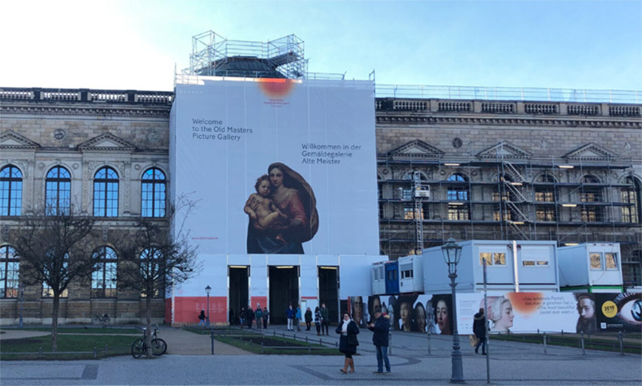Účel: Když Gemäldegalerie Alte Meister v Drážďanech (Sasko) procházela v roce 2018 rekonstrukcí, byl vytvořen tento digitálně tištěný vstup, aby návštěvníci věděli, že je stále otevřená.
