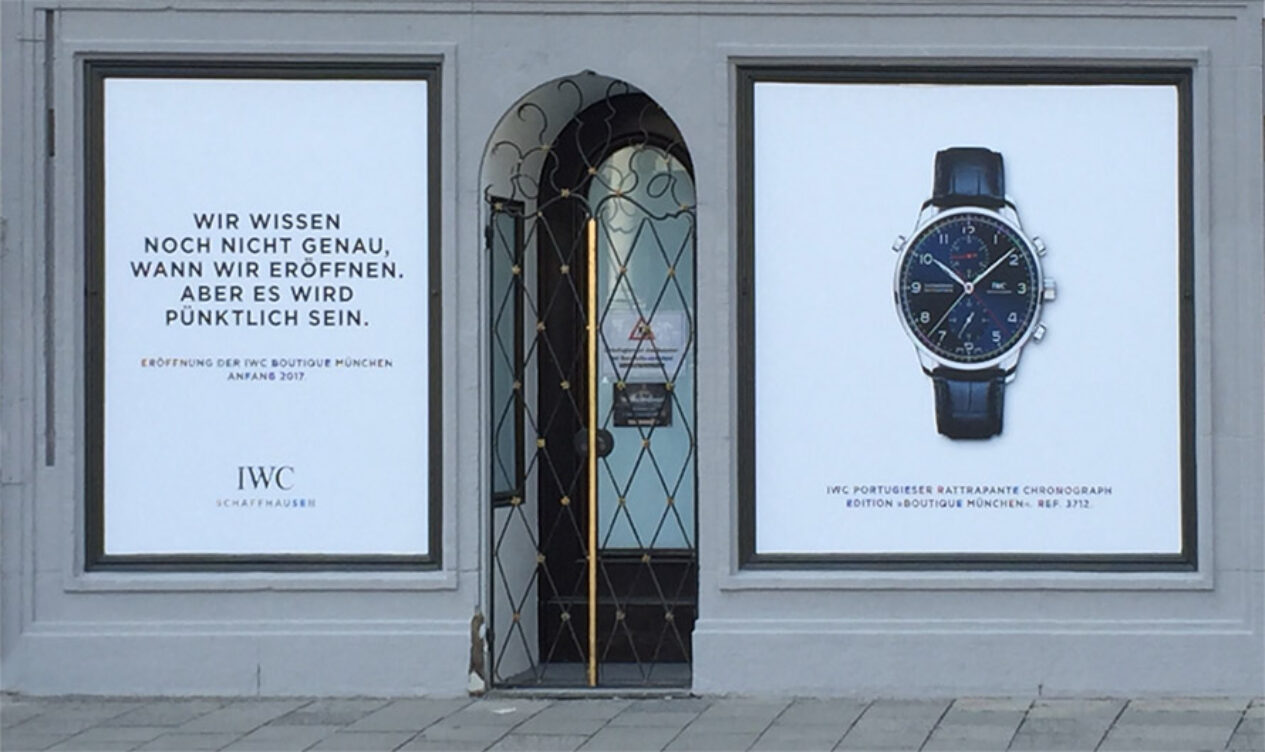 Účel: Značková prodejna hodinek IWC Schaffhausen Fine Watches v Mnichově prochází rekonstrukcí. Na nápisu je napsáno: „Nevíme, kdy budeme moci tuto prodejnu otevřít. Ale buďte si jisti, že to bude přesně na čas.“