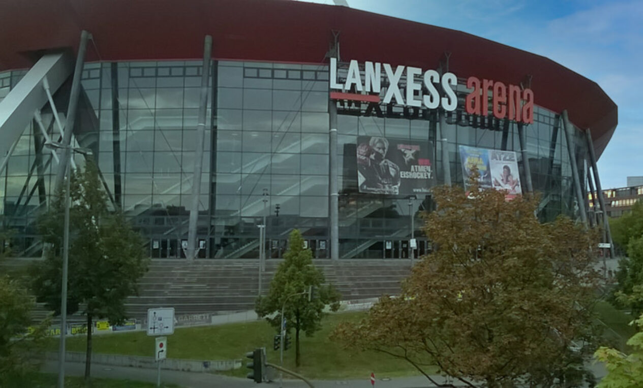 Účel: Lanxess Arena je jednou z největších multifunkčních arén na světě s kapacitou 20 000 diváků. Hlavní vstupní prostor inzeruje nadcházející akce.