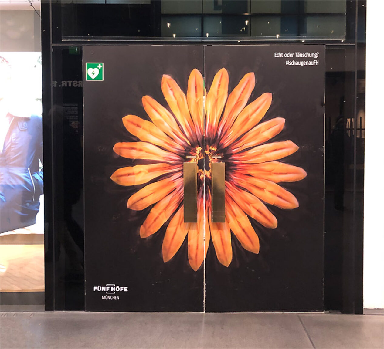 Účel: Tyto zabalené skleněné dveře byly použity k propagaci výstavy „Die Lust der Täuschung“ v Kunsthalle München od listopadu 2018 do ledna 2019 v obchodním centru Fünf Höfe Premium Mall, kde se muzeum nachází.