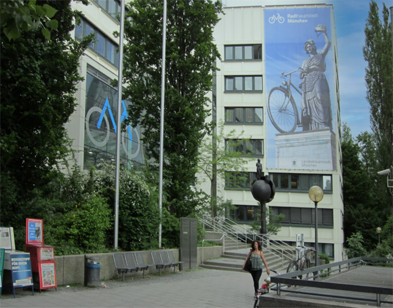 Účel: Širokoformátový plakát byl vystaven u vchodu do mnichovského KVR, ústředního obecního úřadu pro vydávání pasů, uzavírání manželství a dalších základních služeb pro občany. Byl navržen tak, aby napomohl kampani města za větší přátelskost k cyklistům.