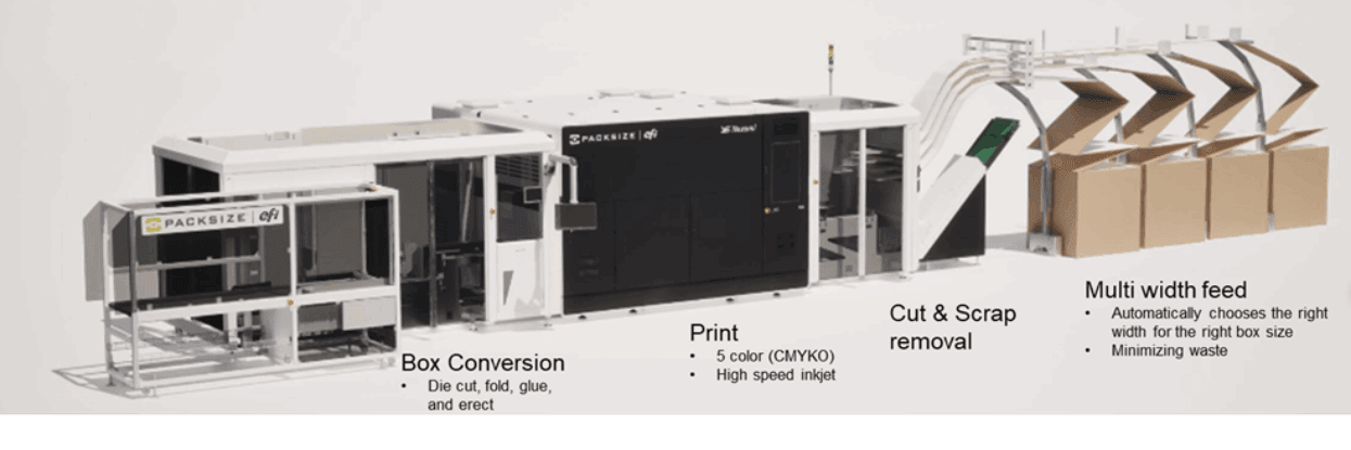 5. Sustainability: The system promotes eco-friendly practices by producing right-sized boxes, which minimize material waste and reduce the need for void fill. Additionally, the use of genuine EFI LED inks ensures compliance with recyclability standards and environmental certifications.