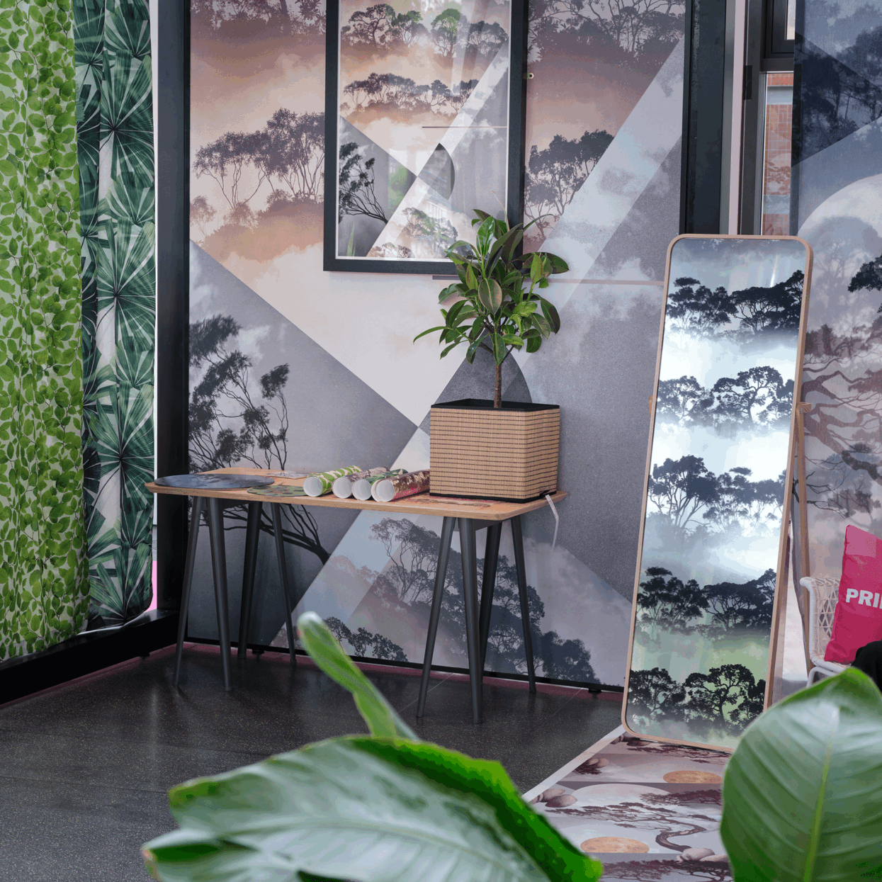 The image below aims to give an indication of the multiple surface effects that can now be created using digital technologies. Showcasing wallcoverings from Canon printed using UV technology, textiles from Durst using dye sublimation onto rPET polyester fabrics from Premier Digital Textiles. Laminated mirrors using printed self-adhesive film from Drytac and personalised flooring kindly printed by MediaCo.