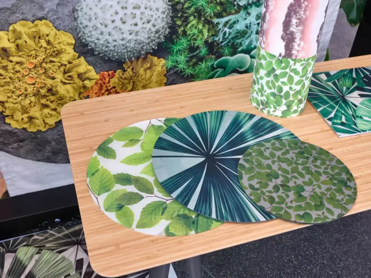 Technologies cross all ink sets. Below we can see personalised acrylic placemats each custom printed to showcase the different surface effects that can be achieved. Recent innovations in white inks have empowered the creativity within the sector further, pushing the boundaries of design and production. Also seen in the right-hand corner of this pic is a piece of UV printed wood, as flatbed technology evolves we are witnessing evermore functionality and the ability to build textured, printed surface effects at increasing print speeds. Samples were kindly supplied by Imageco using HP and others Mimaki technology.