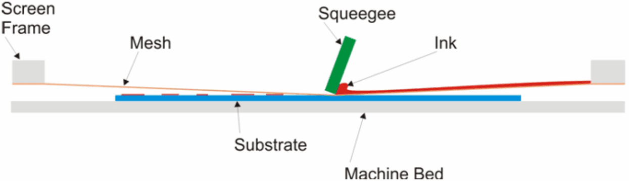 The core of the process is the printing mechanism, with the most commonly used meshed stencil this is as follows.