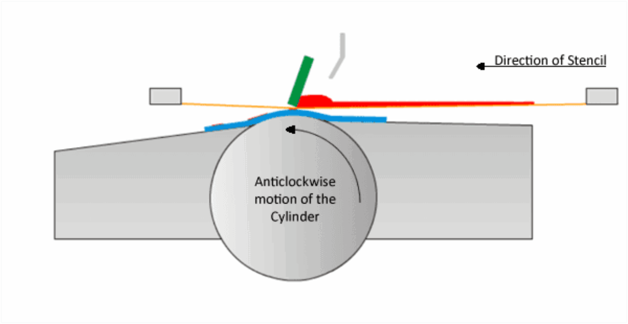 Inside the cylinder are a squeegee and the ink. The squeegee brings the cylinder into contact with the substrate and the ink transfers from the cylinder to the substrate. The cylinder is constructed of a metal mesh through which the ink passes. Often these cylinders are arranged in in groups to produce multi coloured images, for example on textiles that are printed in high volumes.