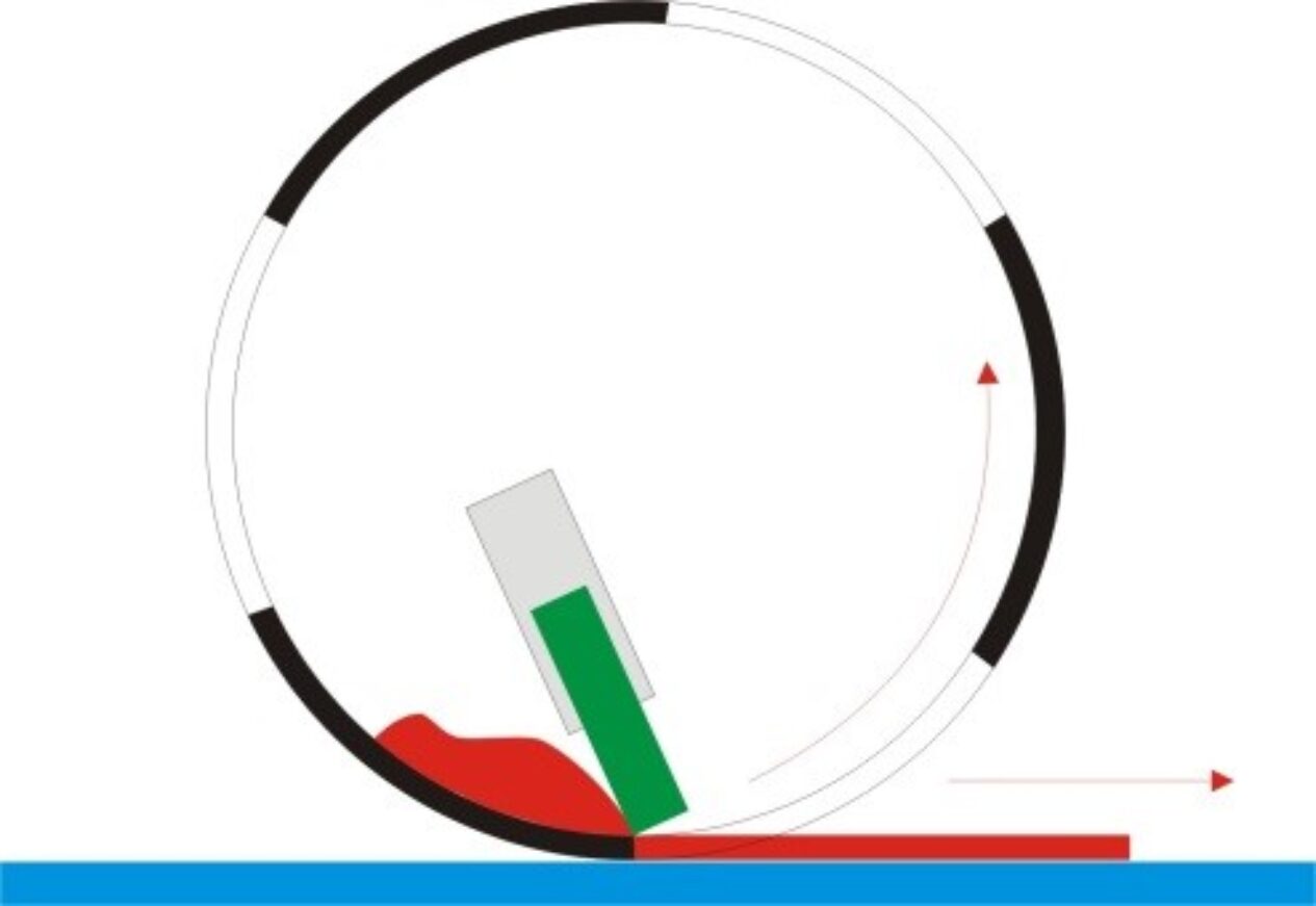 This is an alternative form of printing press as compared to the graphic of the flatbed press shown above. There is a considerable difference in its mechanical operation but the transfer of ink from the mesh to the substrate remains substantially the same.