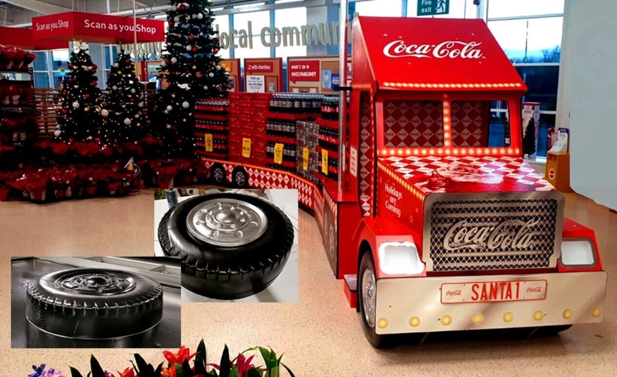 Description: McGowans Print ran its third 3D-printed retail campaign during the festive season, producing POP trucks for 40 Tesco supermarket stores, as well as interactive versions for Odeon cinemas to serve as selfie points. McGowans made the 80 wheels by 3D printing molds, which were then used for thermoforming for extra impact, with black PVC sprayed with metallic chrome paint to replicate real hubcaps.