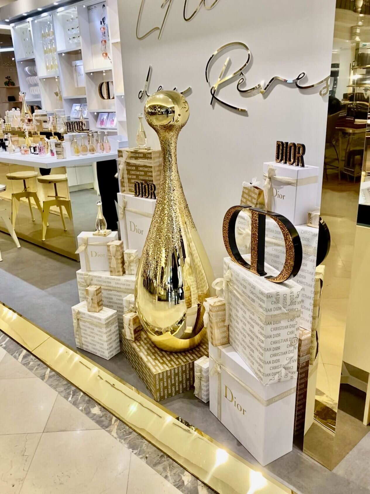 Description: Spanish company ADAEQUO used a Massivit 3D printer to produce 112 giant perfume bottle displays for Dior as part of the fashion brand’s Christmas campaign. After printing, the bottles were sanded and filled with filler, then a shiny black lacquer was applied, followed by a chroming process, before sequins were added with a specially invented spray gun.