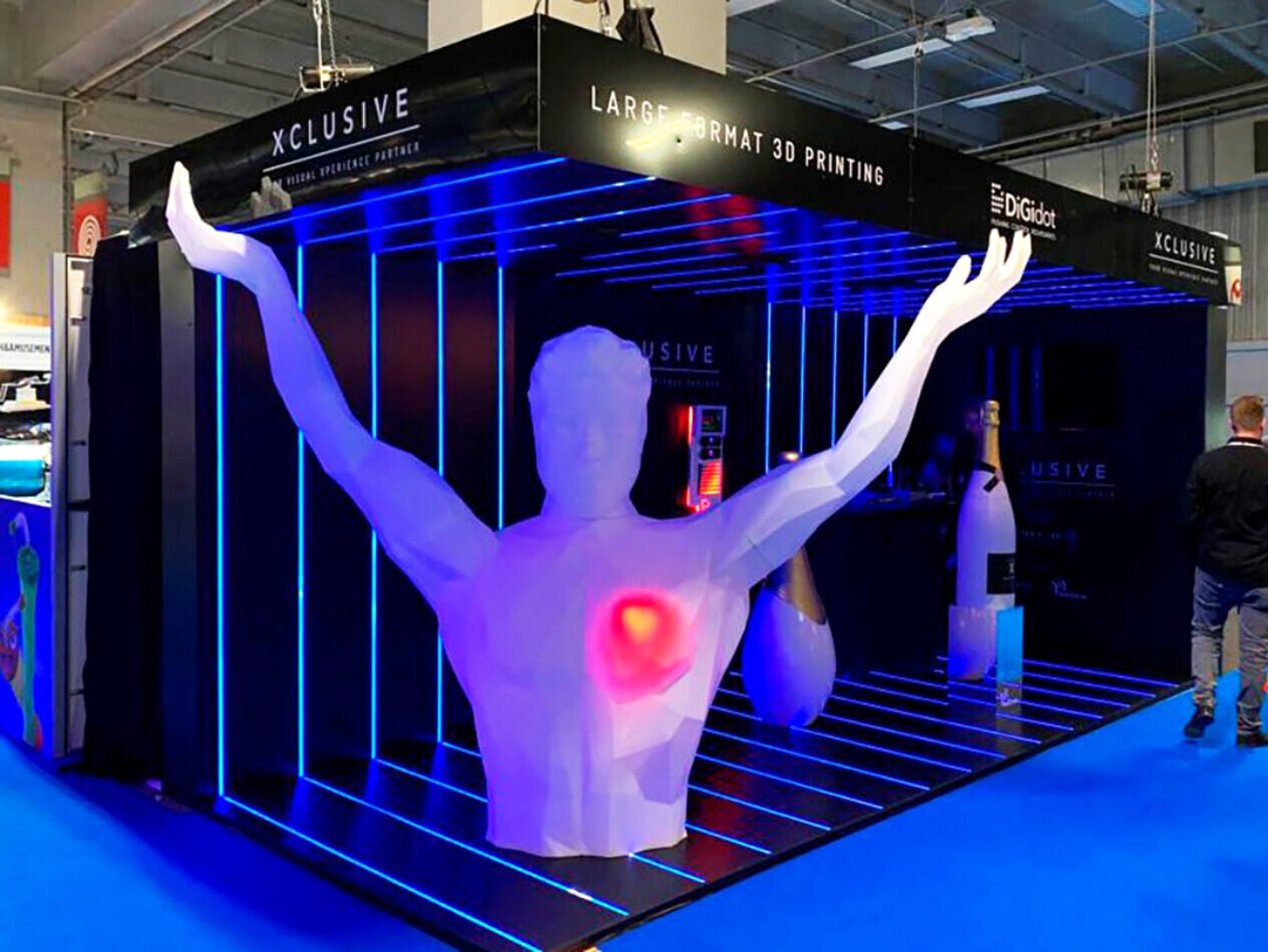 Description: Dutch firm Xclusive International utilised 3D print to create this impressive exhibition stand, the Mister X Booth Display at the IAAPA Expo Europe. Measuring 3.5m tall, Mister X was 3D printed in 26 hours and internally illuminated thanks to the translucent 3D printing gel used on Massivit 3D printers.