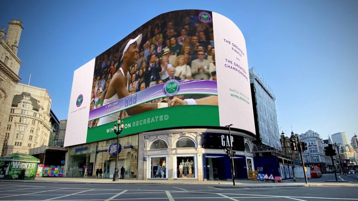 Description: Wimbledon was one of a whole host sporting events to fall victim to the Covid-19 pandemic in 2020, with the tennis tournament cancelled due to the restrictions in the UK. Ocean Outdoor helped soften the blow for fans by running a special campaign at the Piccadilly Lights location in London, showing highlights of some of the greatest Wimbledon finals.