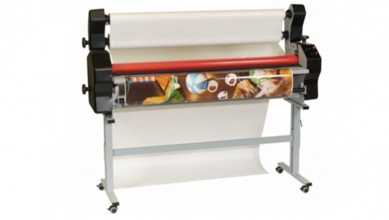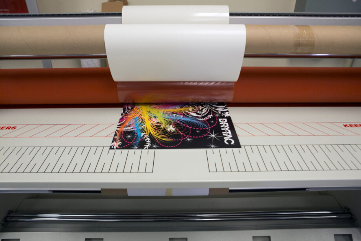 Ici, une pelliculeuse Drytac Jetmounter applique un film transparent à partir d’un rouleau sur une feuille imprimée tout en enroulant le papier de protection sur le rouleau supérieur.
