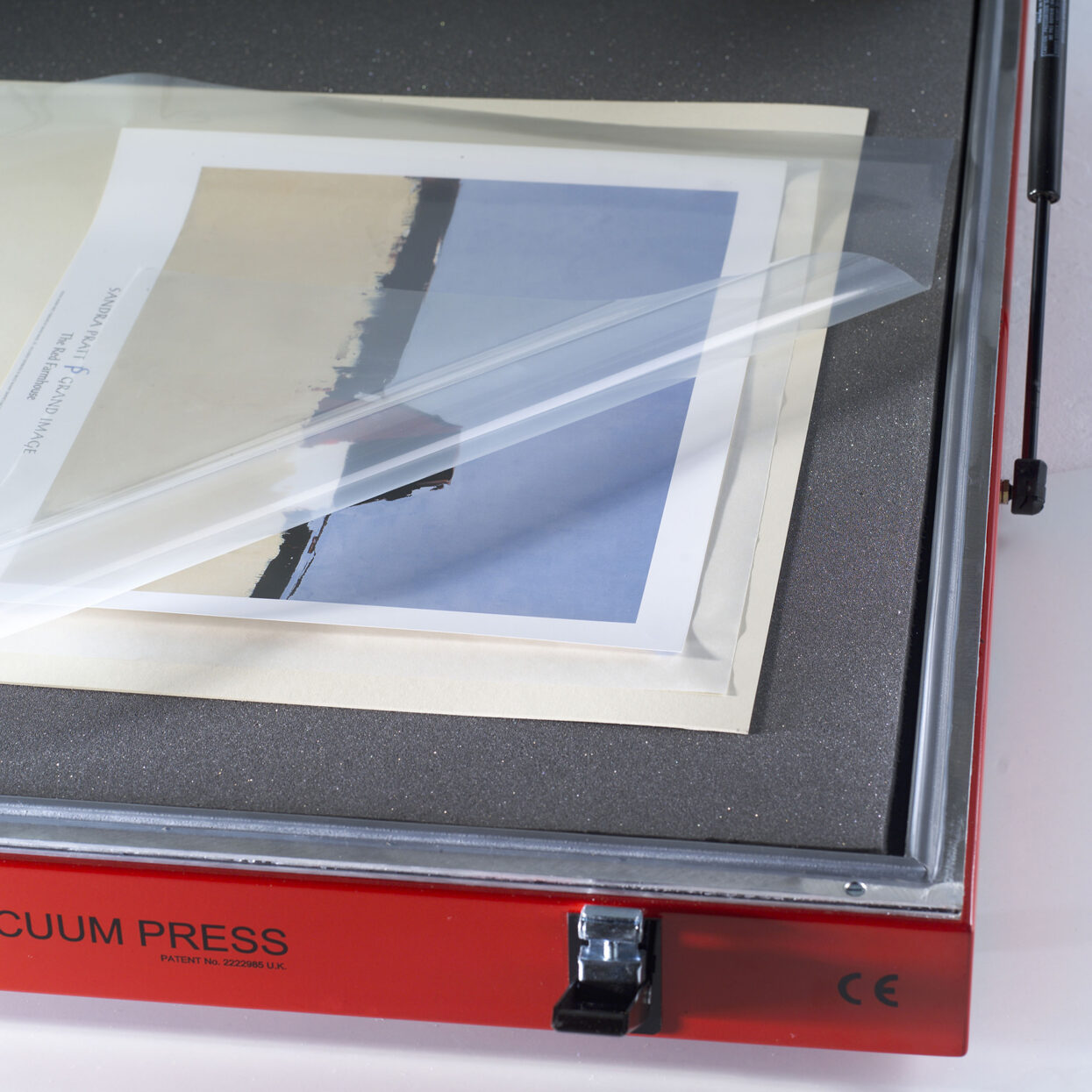 Un cadre sous vide de Hot Press montrant un film supérieur transparent et une feuille de tissu pour montage à sec entre la photographie et le montage.