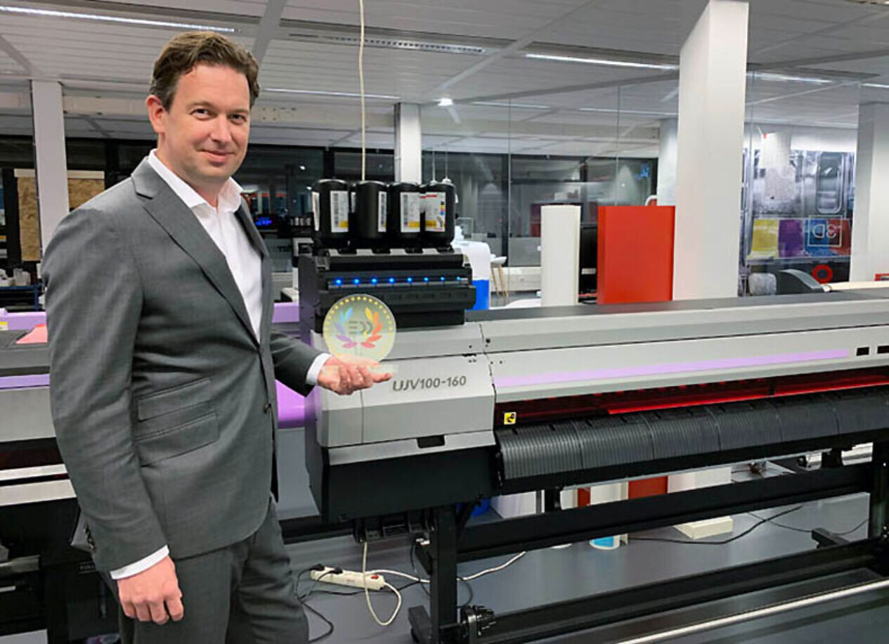 Ronald van den Broek, a Mimaki Europe általános értékesítési vezetője az EDP-díjas UJV100-160-as modellel.