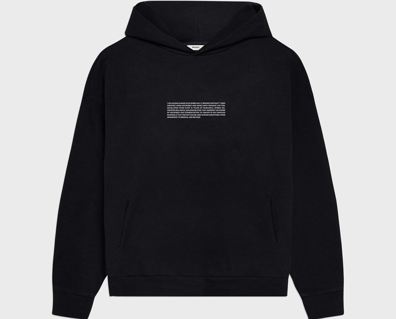 A Pangaia összefogott a Spiber bioanyag-specialistával, hogy elkészítsék az első olyan pulóvert, amelyet a biotechnológiai Brewed Protein felhasználásával gyártottak. A pulóver elejére nyomtatott információk az innovációról és annak a bolygóra gyakorolt előnyeiről szólnak.