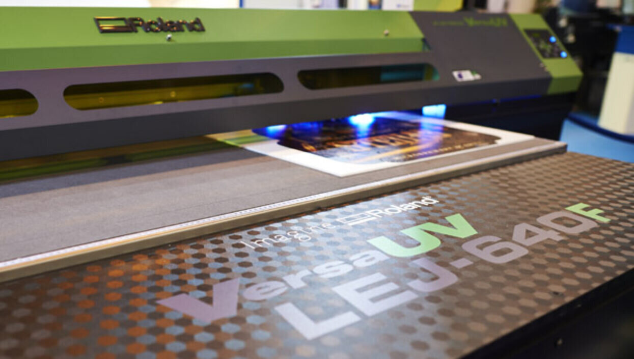 ローランドは、ハイブリッドプリンター「VersaUV LEJ640」(写真下)のフラットベッド版を開発した。LEJ640Fは、同じイメージング・システムを使用しているが、ハイブリッドのテーブルの代わりに実際のベッドを備えている。印刷エリアは1.6 x 2.5mで、最大200kgまでの基板に対応する。ローランドのエコUVインクを使用し、LED硬化方式を採用している。カラーチャンネルは6色で、白2色、グロス2色、または2色とCMYKの混合から選択できる。解像度は1440×1440dpiで、毎時12平方メートルの印刷が可能だ。