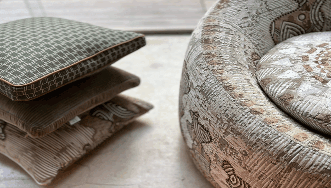 KornitsとNiso Furinitureのコラボレーションでは、プリントされた美しいブークレ、ベルベット、シアーボイル、ヴィーガンレザー、高級テキスタイル基材に直接xDI次元表面プリントを施した。