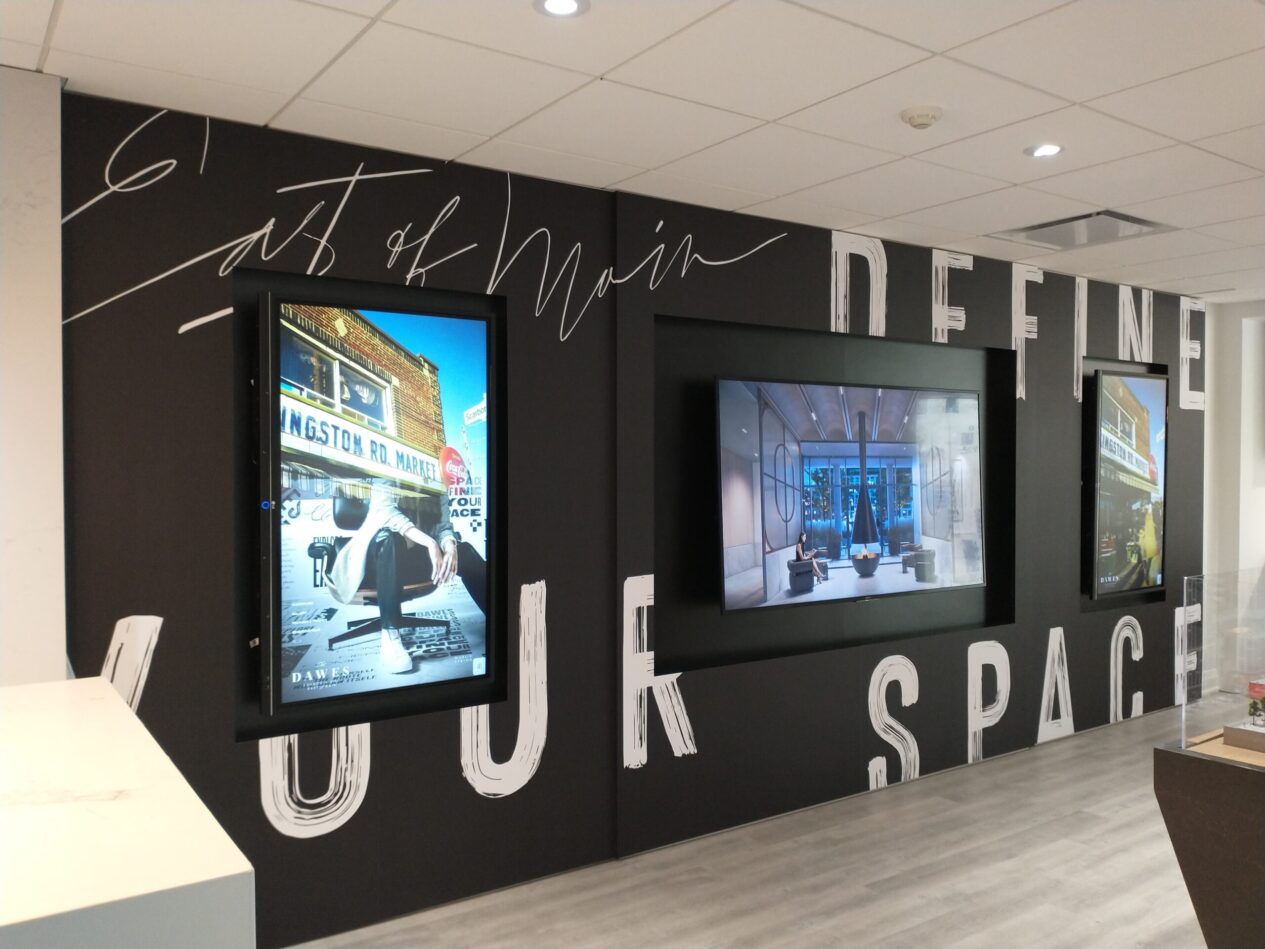 टोरन्टो-आधारित मिनोह इंकले ड्राईट्याक रिट्याक टेक्सचर्स लिनेन इम्बोस्ड फिल्म प्रयोग गरेर भित्ता ग्राफिक्सको श्रृंखला सिर्जना गर्यो जुन रियल इस्टेट कम्पनी मार्लिन स्प्रिंगको लागि फराकिलो आन्तरिक भिडियो भित्ता प्रदर्शनको भागको रूपमा एकीकृत गरिएको थियो। चतुर डिजाइनले स्क्रिनहरूलाई अवरोध नगरी सम्पूर्ण भित्तालाई ढाक्यो।
