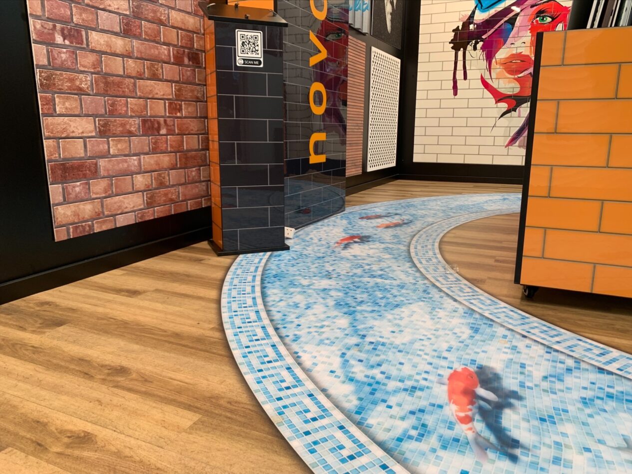ग्लासगो-आधारित नोभोग्राफले प्रदर्शनीमा आफ्ना सेवाहरू प्रदर्शन गर्न चलाख र आकर्षक भुइँ ग्राफिक्सको सेट सिर्जना गर्न सोयाङ बिल्ड सिरेमिक प्रयोग गर्यो। नोभोग्राफले मोजेक टाइलहरू र माछाको प्रतिकृति छापिएको ग्राफिकको साथ एक अनुकूलित काठ र टाइल भुइँ उत्पादन गर्यो, जसले माछाहरू यसको स्ट्यान्ड मार्फत नदीमा पौडी खेलिरहेका छन् भन्ने प्रभाव दिन्छ।