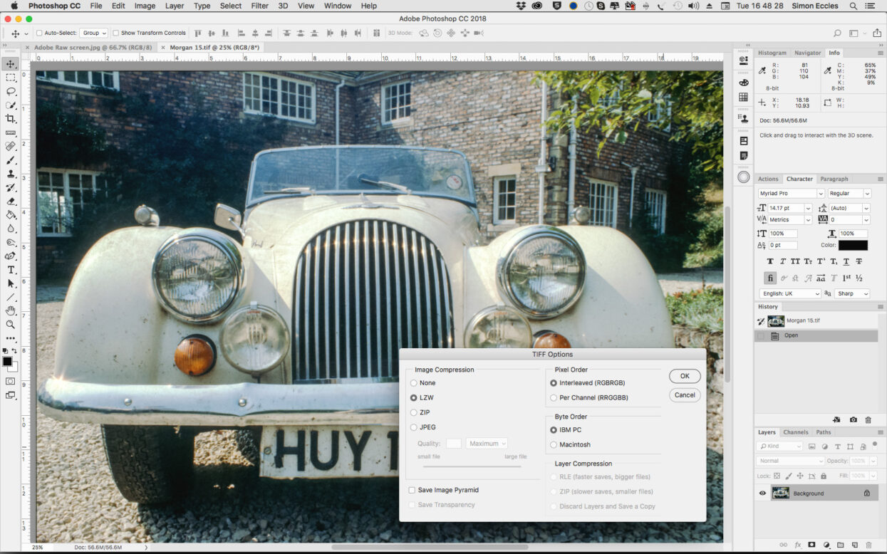 TIFF-bestanden zijn veel groter dan gecomprimeerde JPEG’s. Photoshop en de meeste andere beeldbewerkers kunnen optioneel opslaan met LZW lossless compressie, wat de bestandsgrootte ongeveer halveert zonder de kwaliteit te beïnvloeden.