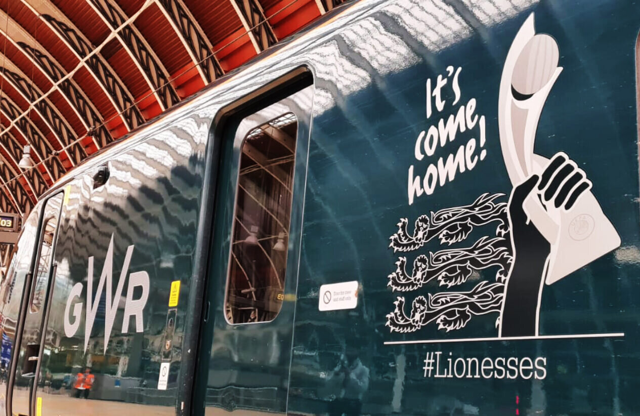 Opis: Great Western Trains (GWR) w Wielkiej Brytanii uczciło zwycięstwo reprezentacji Anglii w Euro 2022 specjalnym zestawem grafik na boku jednego ze swoich pociągów. Grafika przedstawiała trofeum i słynne trzy lwy angielskiej piłki nożnej.