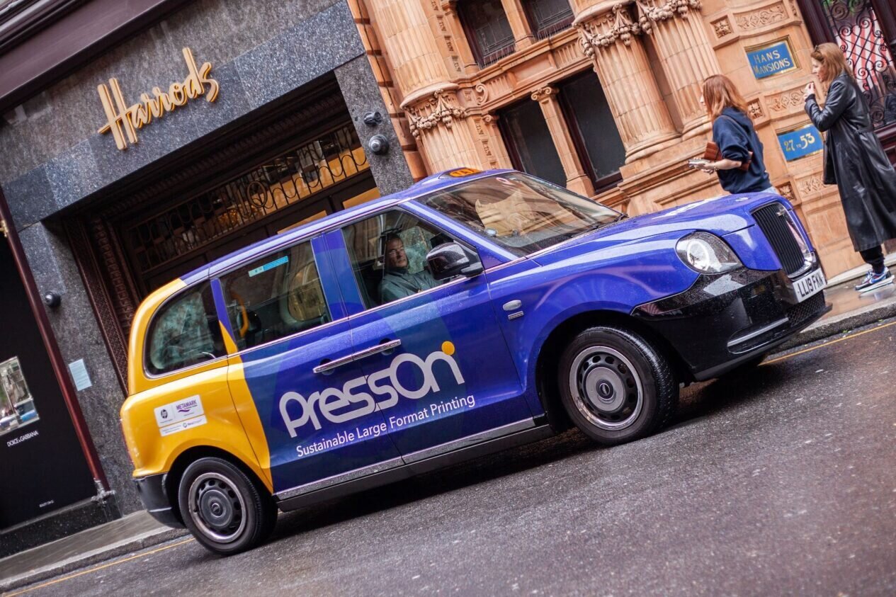 Opis: Wśród najbardziej kultowych pojazdów na świecie, londyńskie czarne taksówki stały się mobilnym billboardem dla wszelkiego rodzaju marek. Brytyjska firma poligraficzna PressOn okleiła sześć elektrycznych taksówek, aby promować swoje zróżnicowane usługi poligraficzne wśród londyńczyków i turystów. Grafika została wydrukowana przy użyciu drukarki HP Latex R2000 na materiałach Metamark.