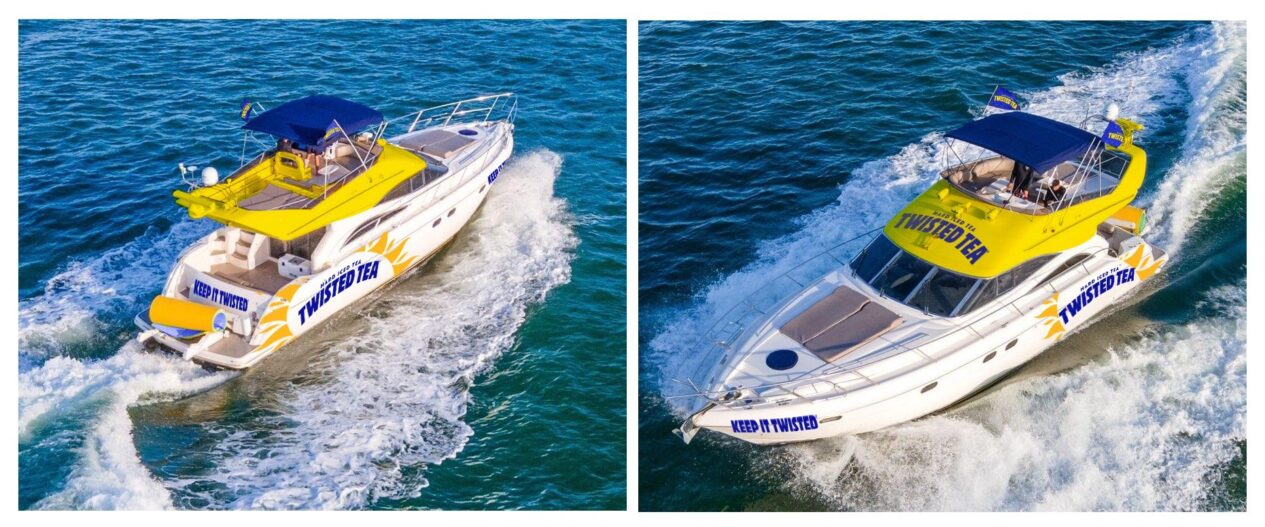 Opis: Twisted Tea Hard Iced Tea zapakowała łódź na specjalną promocję, którą prowadziła podczas rywalizacji w futbolu uniwersyteckim Floryda-Georgia USA. Jeden fan, wraz z trzema gośćmi, mógł wygrać dwudniowy pobyt na 56-stopowej łodzi Viking Princess.