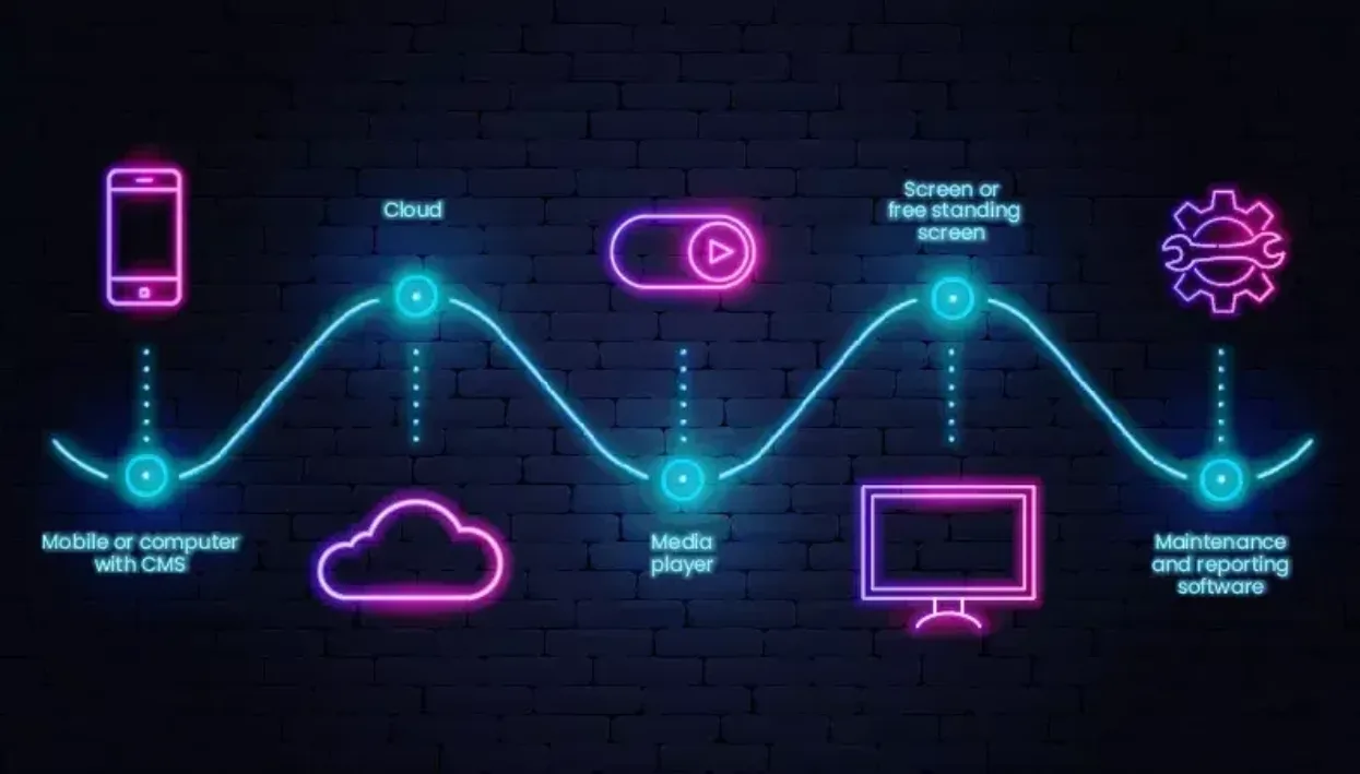 Vamos rever os princípios básicos. A sinalização digital utiliza ecrãs de visualização para mensagens de marketing, operacionais e outras mensagens comerciais. Variando em tamanho, desde ecrãs de LED para prateleiras até ecrãs LED para paredes inteiras, a sinalização digital tem obviamente a vantagem de poder atualizar o conteúdo regularmente, quer seja de acordo com uma programação ou a pedido.