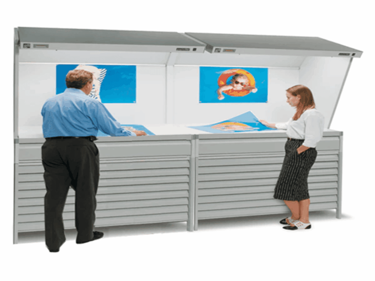Rozmanité trhy, ktoré pokrývajú odvetvia veľkoformátovej tlače, sťažujú výber podmienok osvetlenia. K dispozícii sú kabíny s viacerými prepínateľnými zdrojmi svetla, ktoré môžu pomôcť. Svetelné zdroje môžu zahŕňať D65 (priemerné denné svetlo zo severnej oblohy), A (žiarovka), TL84/F11 (osvetlenie obchodu) a D50 (poludňajšie denné svetlo).