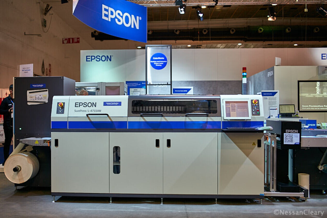Epson tillverkar SurePress L4000-serien, som använder ett vattenbaserat hartsbläck som också uppfyller kraven för indirekt livsmedelsanvändning. Den senaste L-4733AW har fått en ny AQ T4-bläckuppsättning, som består av CMYKOG plus vitt, samt mer automatisering. Den har en hastighet på 8,2 mpm och använder skrivhuvuden från Epson för att producera en upplösning på 720 x 1440 dpi.