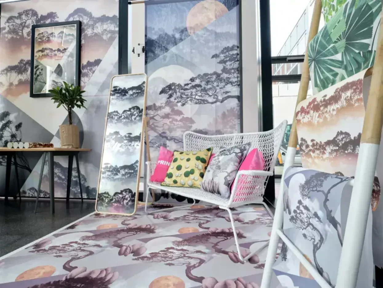 Aşağıda yer alan resim, bir iç mekan oluşturmak için sıklıkla kullanılan ürünlerden sadece bazılarını göstermektedir. Bu resimde Image Co tarafından sağlanan geri dönüştürülmüş duvar kağıdı alt tabakaları üzerine HP Latex kullanılarak basılan duvar kağıtları, Drytac tarafından Mimaki teknolojisi kullanılarak basılan lamine aynalar, Media co’dan boya süblimasyonu kullanılarak basılan zemin kaplamaları ve yine Sentec International’dan HP teknolojisi kullanılarak basılan duvar kaplamaları bulunmaktadır. Bunlar birlikte konut için benzersiz bir görsel hikaye oluşturuyor.